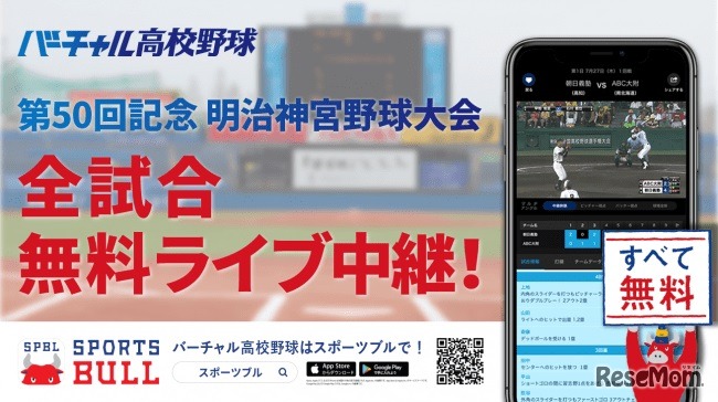 朝日新聞社と朝日放送テレビは、共同で運営する「バーチャル高校野球」で、2019年11月15日に開幕する「第50回記念 明治神宮野球大会」の全19試合をライブ中継する。バーチャル高校野球はスポーツメディア「SPORTS BULL(スポーツブル)」から無料で視聴できる。