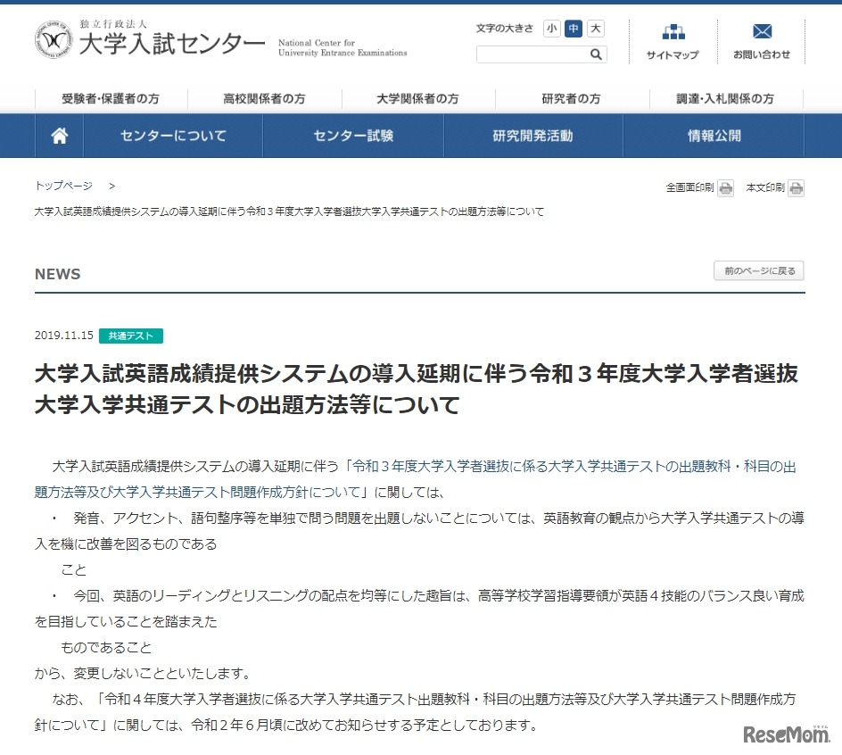 大学入試センターは2019年11月15日、大学入試英語成績提供システムの導入延期に伴う令和3年度(2021年度)大学入学者選抜大学入学共通テストの出題方法等について発表した。英語の出題方法や問題作成方針に変更はないという。