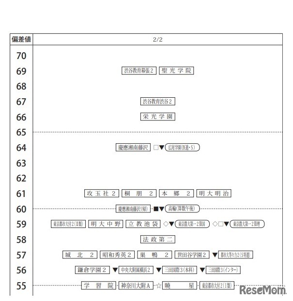 四谷大塚は、2019年11月10日に実施した小学6年生対象「第5回合不合判定テスト」の偏差値一覧を公表した。難関校の合格可能性80%偏差値は、男子が筑波大駒場(72)、開成(71)、女子が桜蔭(70)、女子学院(69)など。