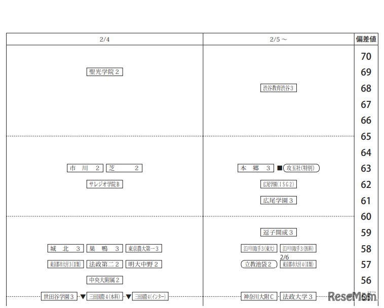 四谷大塚は、2019年11月10日に実施した小学6年生対象「第5回合不合判定テスト」の偏差値一覧を公表した。難関校の合格可能性80%偏差値は、男子が筑波大駒場(72)、開成(71)、女子が桜蔭(70)、女子学院(69)など。