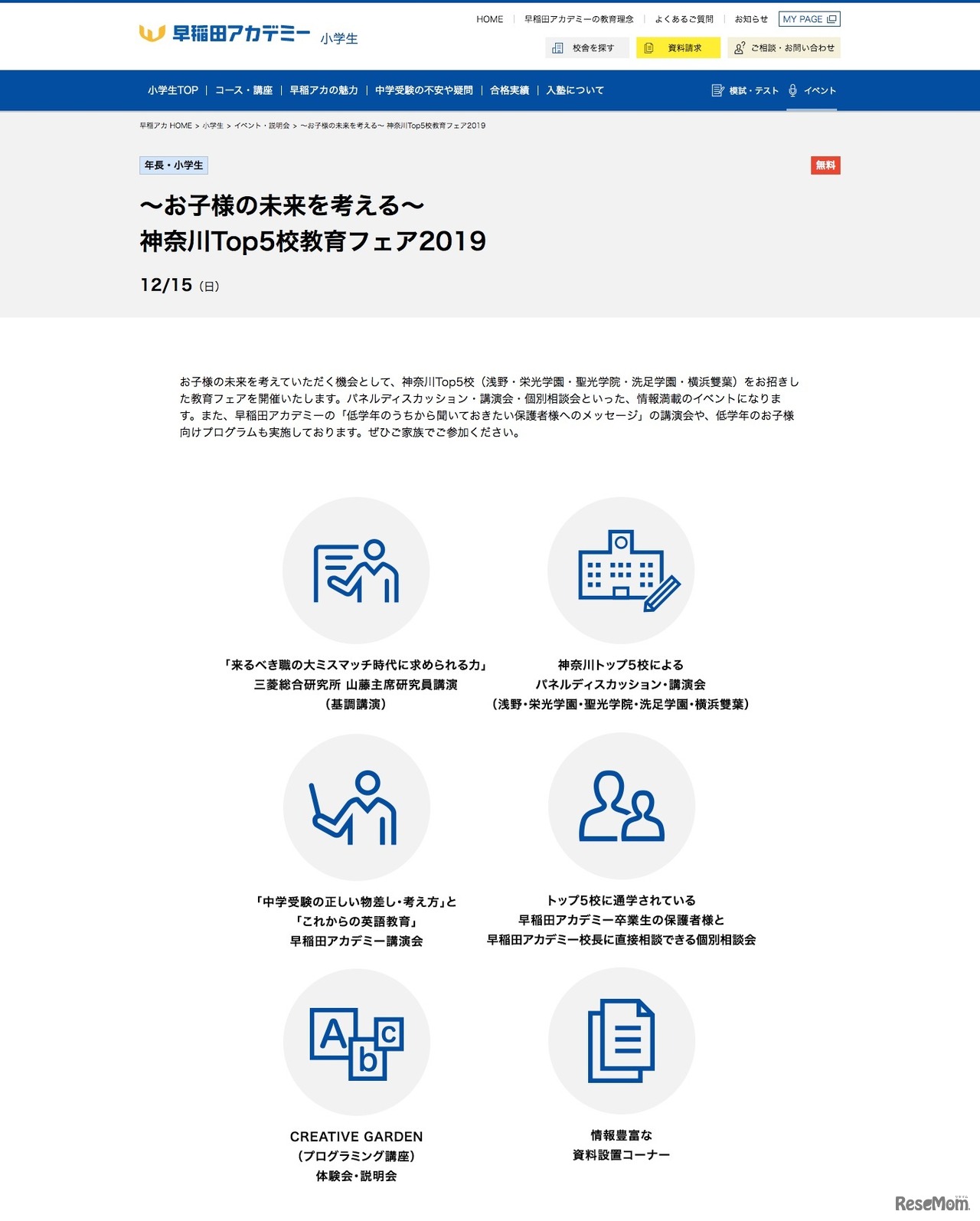 早稲田アカデミーは2019年12月15日、「神奈川Top5校教育フェア2019」を開催する。浅野・栄光学園・聖光学院・洗足学園・横浜雙葉を招いた教育フェアで、講演や個別相談会を実施。年長と小学生の保護者が対象。参加無料、事前申込制。