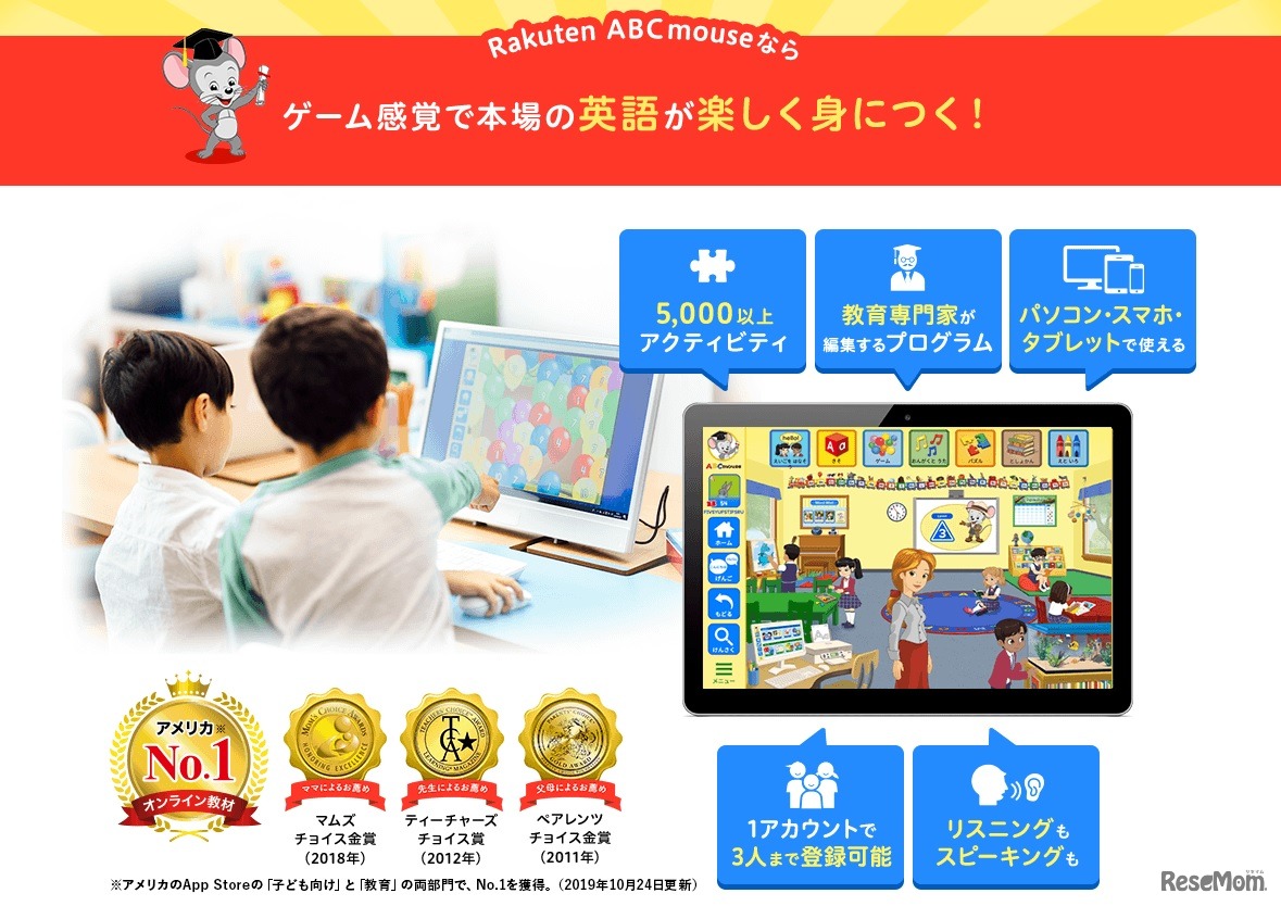 楽天は、子ども向けデジタル学習教材などを開発するAge of Learningと業務提携し、児童向け英語教育サービス「Rakuten ABCmouse」の販売を開始した。対象は3歳から8歳の児童で、料金は月額1,780円(税込)から。