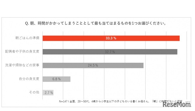 かまぼこなどの練製品を製造販売する一正蒲鉾は、働く母親の朝の準備に関する調査を実施。1日のうち1番時間がないのは「朝」で、もっとも時間がかかるのは「朝ごはんの準備」という結果になり、理想の準備時間は平均18.4分だった。