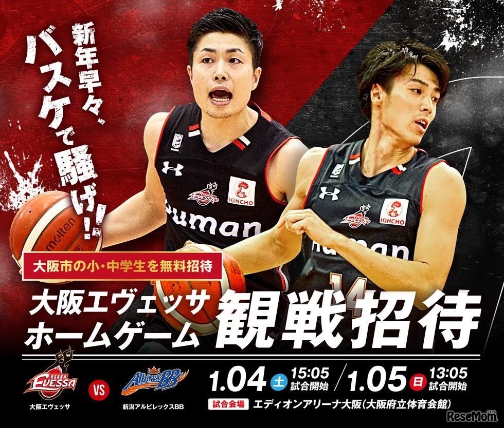 大阪市は、2020年1月4日と5日にエディオンアリーナ大阪(大阪府立体育館)で行われる「Bリーグ2019-20シーズン B1リーグ第16節 大阪エヴェッサ対新潟アルビレックスBB戦」において、大阪市内の小中学生を招待する。