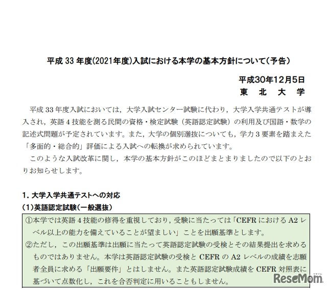 東北大学「平成 33 年度(2021年度)入試における本学の基本方針について(予告)」