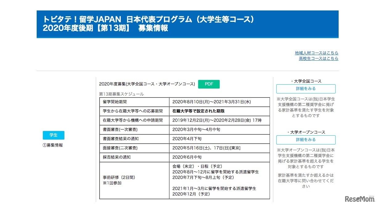 日本学生支援機構は2019年12月2日、官民協働海外留学支援制度「トビタテ!留学JAPAN日本代表プログラム」大学生等コースの第13期派遣留学生の募集を開始した。4コースで400名募集予定。締切りは2020年2月28日午後5時。