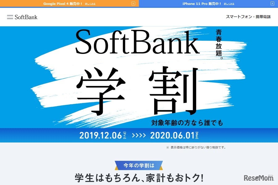 ソフトバンクは、学割キャンペーンとして「SoftBank学割」を2019年12月6日より実施する。「ウルトラギガモンスター+(プラス)」および「ミニモンスター」の基本プラン(音声)を6か月間無料で利用できるなど、各料金プランをお得に利用できる。