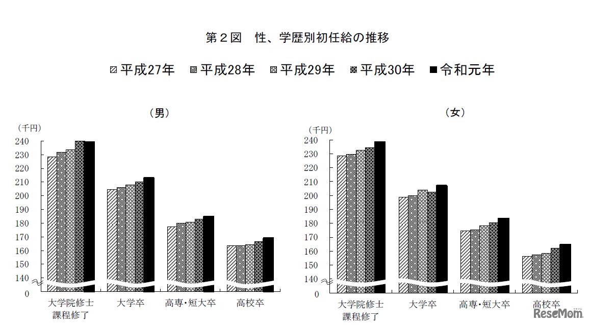 画像出典:厚生労働省「令和元年賃金構造基本統計調査(初任給)の概況」 性・学歴別初任給の推移