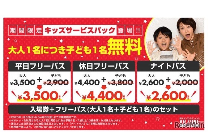 VR ZONE OSAKAは、2020年1月6日から4月5日の期間限定で「キッズサービスパック」を導入する。「フリーパス」「ナイトパス」を利用する大人1名に同行する7歳以上13歳未満の子ども1名が、10種のアクティビティを無料で体験できるお得なチケットだ。