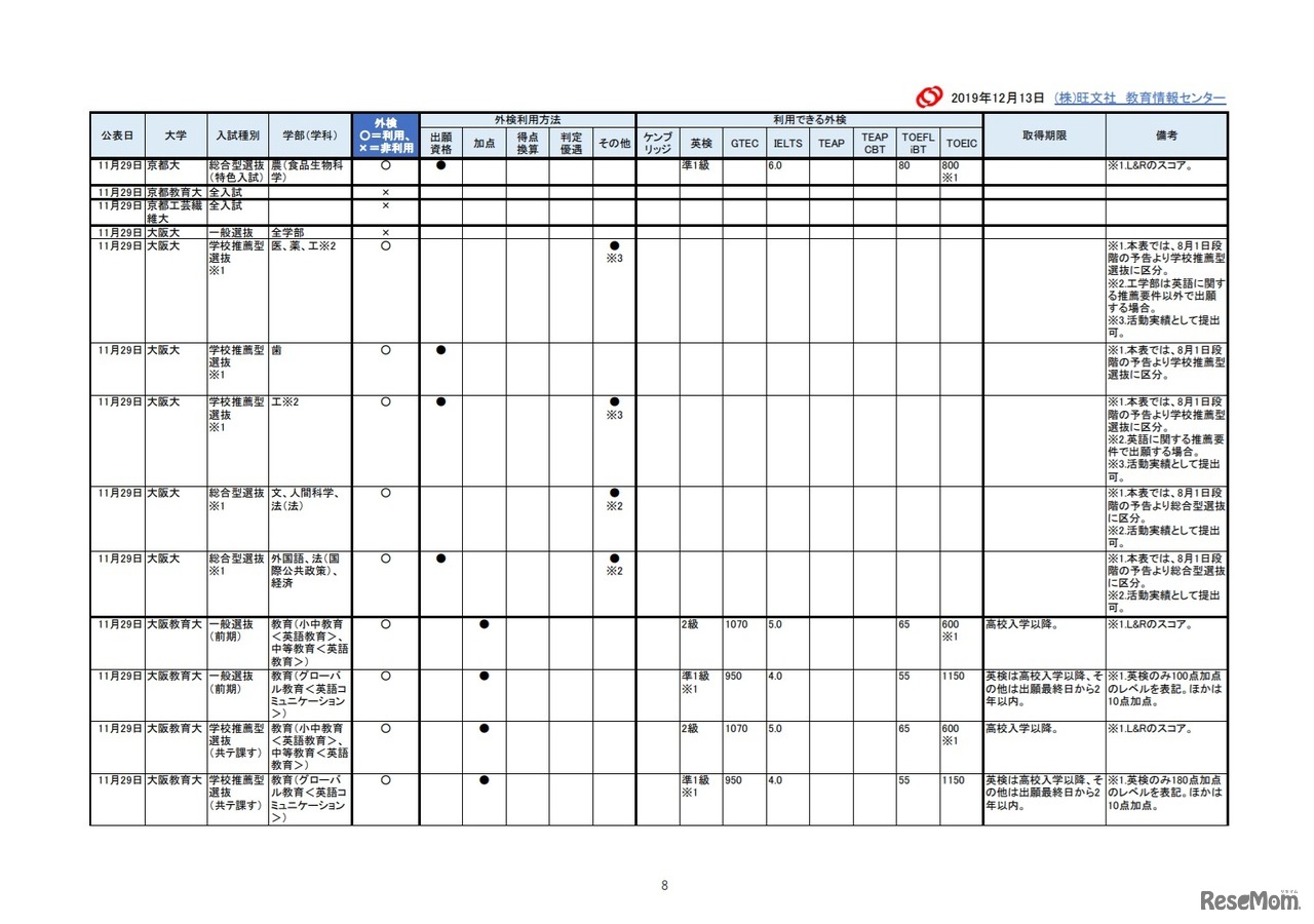 旺文社教育情報センターは2019年12月13日、国立大学の2021年度入試の英語外部検定利用について、成績提供システム見送り後の修正予告一覧を公表した。一般選抜で外検を利用するのは、九州大学、東京海洋大学、広島大学など。