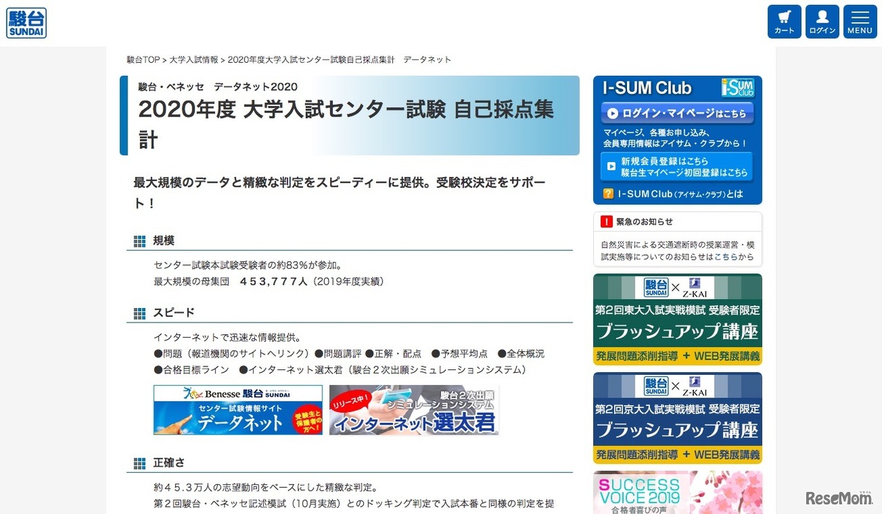 駿台は2019年12月13日、「2020年度大学入試センター試験自己採点集計 データネット」についての案内を掲載した。12月下旬より配布される「集計カード」は、2020年1月20日午後5時までに最寄りの駿台校舎窓口に提出する。