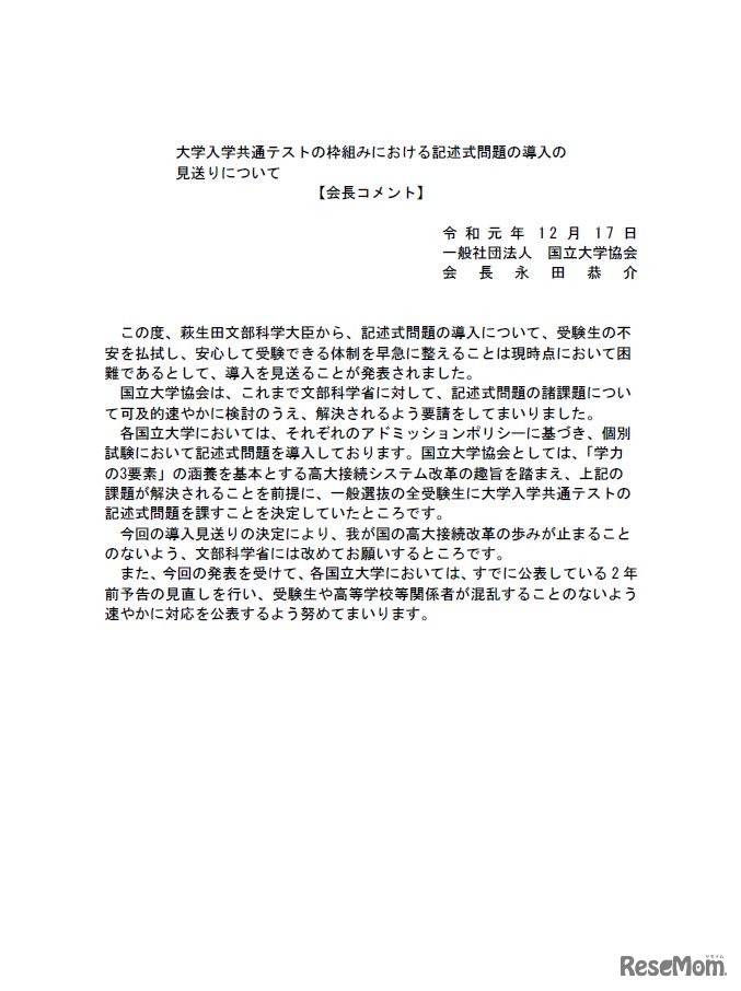 文部科学省が2019年12月17日、2021年1月実施の大学入学共通テストで記述式問題導入を見送ると発表したことを受け、国立大学協会や大学入試センターなどがコメントを発表した。受験生や高校関係者らに向けて、今後の対応なども説明している。