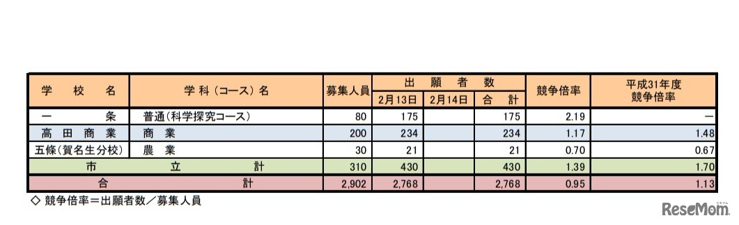 奈良県教育委員会は2020年2月13日、2020年度奈良県公立高校入学者特色選抜について、2月13日時点の出願状況を発表した。募集人員2,902人に対し、志願者が2,768人で競争倍率は0.95倍。競争倍率がもっとも高い学校は、市立一条(普通・科学探究コース)2.19倍だった。