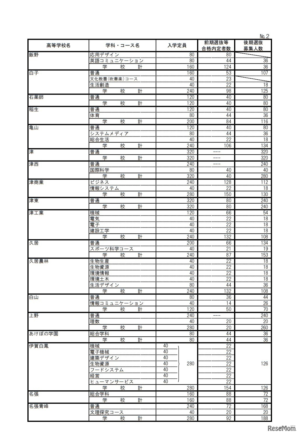 三重県教育委員会は2020年2月15日、2020年度三重県立高等学校前期選抜等合格内定者数および後期選抜募集人数を発表した。入学定員1万2,670人に対し、前期選抜などの合格内定者数は4,110人だった。また、後期選抜では、8,438人を募集する。