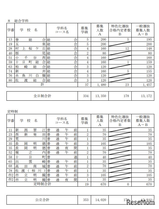 新潟県教育委員会は2020年2月14日、2020年度(令和2年度)新潟県公立高等学校入学者選抜特色化選抜実施状況および一般選抜募集人数を発表した。全日制課程における特色化選抜の合格内定者数は178人、一般選抜で1万3,172人を募集する。