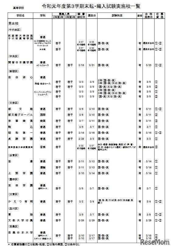 画像出典:東京都「令和元年度第3学期末転・編入試験実施校一覧」 私立高校・男女校