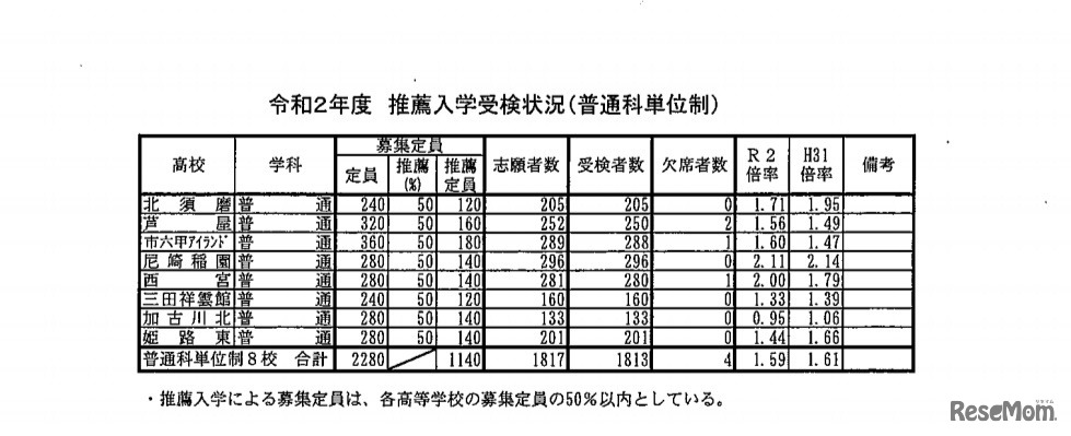 画像出典:兵庫県教育委員会 令和2年度推薦入学受検状況(普通科単位制)