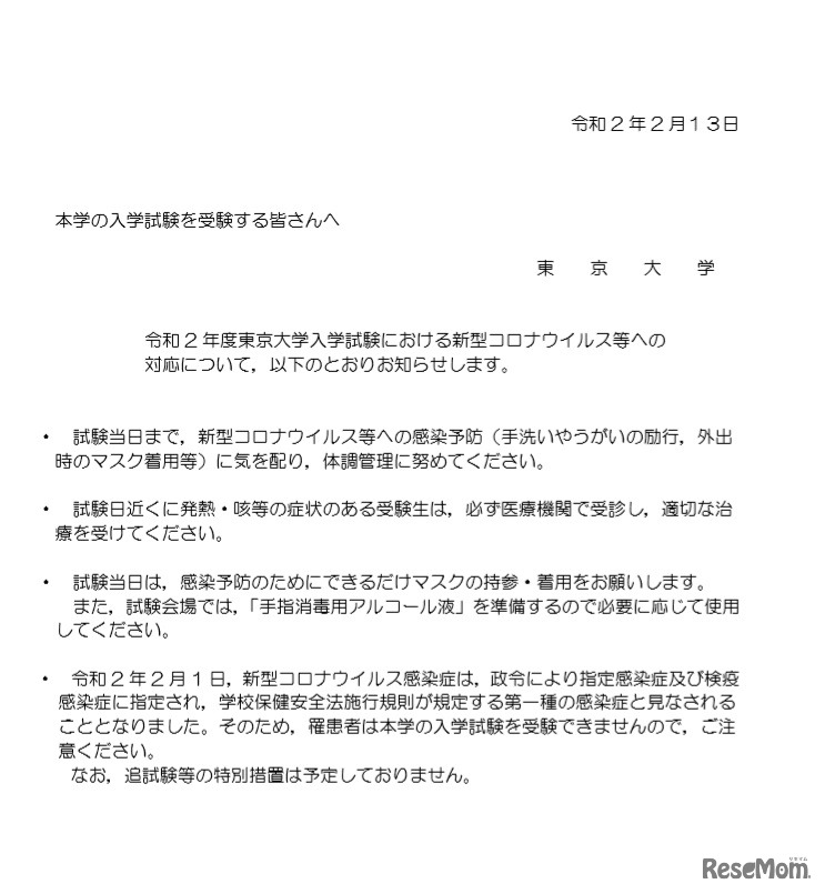 北海道大学は2020年2月18日、受験予定者が新型コロナウイルスに感染し一般入試が受験できなくなった場合の対応として、出願書類などによる総合的な判定を行う予定として公表。一方、東京大学は罹患者は追試験など特別措置を行わないなど、大学によって対応が異なっている。