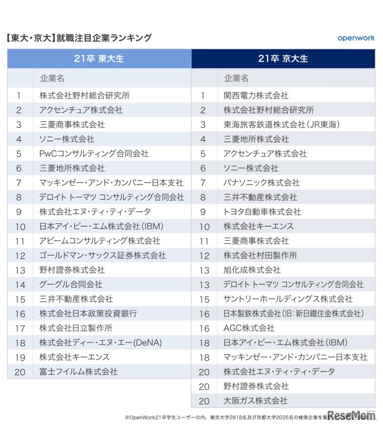 2021年卒の就活生が選ぶ注目企業ランキング1位は、東大生が「野村総合研究所」、京大生が「関西電力」であることが、オープンワークが発表した調査結果より明らかになった。早慶学生とMARCH学生のランキングでは、いずれも「アクセンチュア」が1位だった。