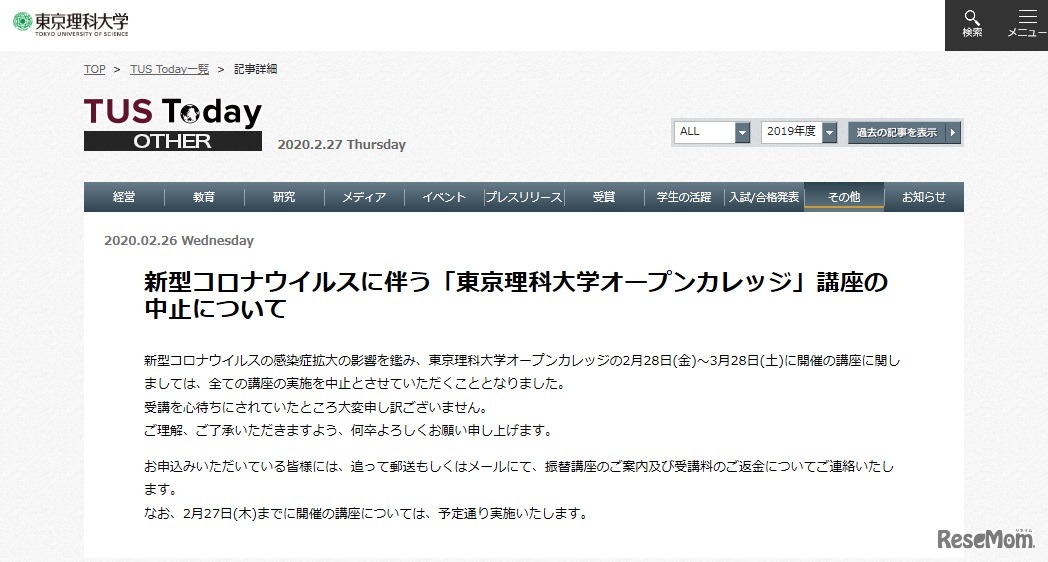 法政大学は2020年2月27日、新型コロナウイルス感染症の影響拡大に伴い、卒業式を中止することを公表した。そのほか、東京理科大学はオープンカレッジ、青山学院大学は箱根駅伝祝勝会の開催を中止するなど、各大学のイベントに影響が出ている。