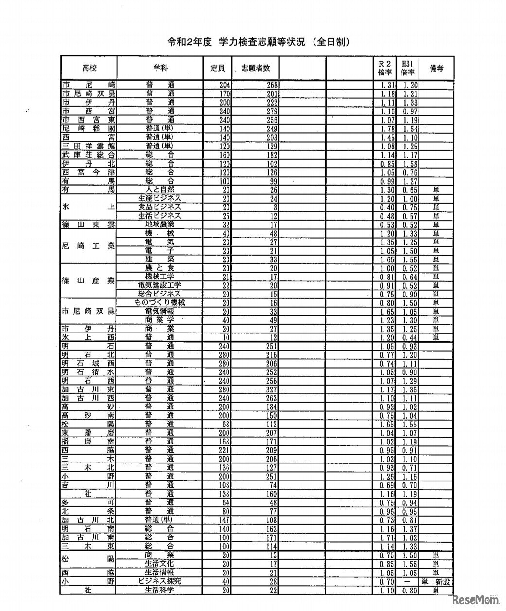 兵庫県教育委員会は2020年2月27日、2020年度兵庫県公立高等学校入学者選抜の出願状況について、全日制出願受付2日目の2月27日正午時点における学力検査志願状況および倍率を公表した。各学校の出願倍率は、神戸(普通)1.07倍、長田(普通)1.25倍など。