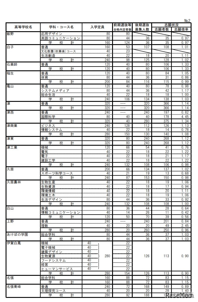 三重県教育委員会は2020年3月6日、2020年度(令和2年度)三重県立高等学校後期選抜について最終の志願状況を発表した。学校・学科別の志願倍率は、四日市(普通)0.68倍、四日市(国際科学)2.85倍、津西(国際科学)4.45倍など。