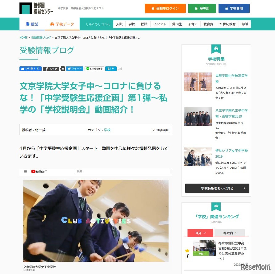 首都圏模試センターは、2020年4月から「中学受験生応援企画」と題した情報発信を開始。第一弾として、首都圏の私立中学校の学校説明を動画で紹介している。