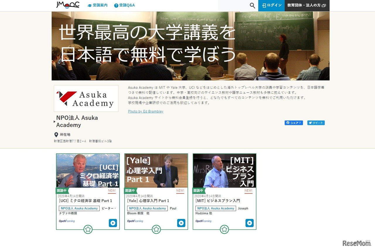 日本オープンオンライン推進協議会(JMOOC)とネットラーニングは2020年4月14日、Asuka Academyが提供する講座のうち、特に受講者数が多い「ビジネスプラン」「心理学」「ミクロ経済学」の3講座を、JMOOC公認プラットフォーム「OpenLearning, Japan」にて開講する。
