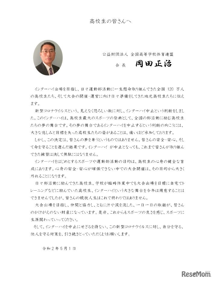 日本中学校体育連盟は2020年4月28日、新型コロナウイルスの感染拡大を受け、2020年度の全国中学校体育大会の中止を決めた。すでにインターハイ中止を公表している全国高等学校体育連盟は、全国の高校生に向けてWebサイトにメッセージを掲載した。