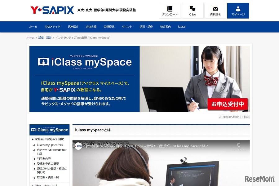Y-SAPIXは2020年5月7日、新型コロナウイルス感染拡大の影響により5月期の対面授業をオンラインに移行すると発表した。対象期間は5月11日~6月6日。すべての本科生(在籍生徒)にインタラクティブWeb授業iClass mySpace(アイクラス マイスペース)を提供する。