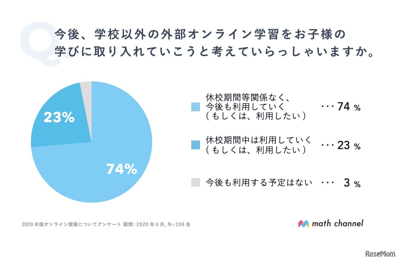 算数・数学の楽しさを伝えるmath channelは、小学生・未就学児の子どもを持つ保護者を対象に「オンラインでの学び」に関するアンケート調査を実施。現在81%がオンライン学習を利用しており、さらに74%の家庭が休校期間終了後もオンライン学習を利用したいと答えた。