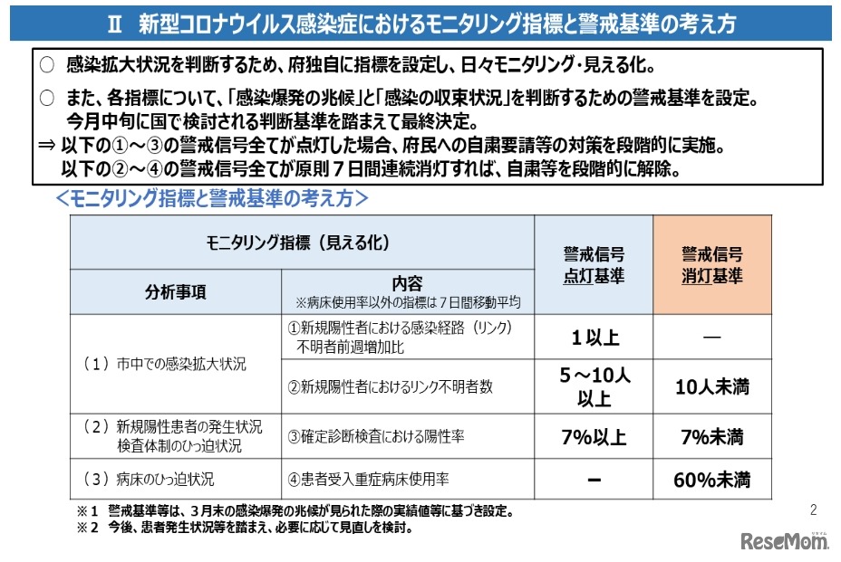 画像出典:大阪府 新型コロナウイルス感染症におけるモニタリング指標と警戒基準の考え方