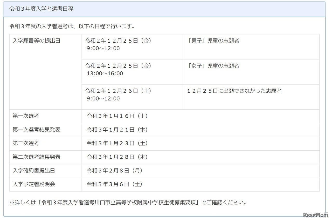 画像出典:川口市立高等学校附属中学校 2021年度入学者選考日程