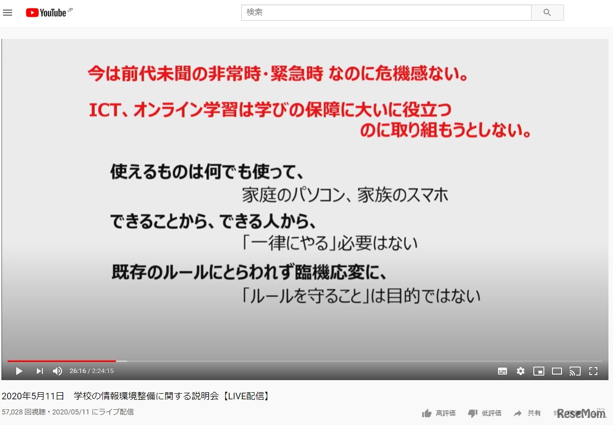 文部科学省は、教育委員会らを対象に2020年5月11日に開催した「学校の情報環境整備に関する説明会」の映像をYouTubeのGIGAスクールchで公開している。危機感をもって学校のICT活用を進めてほしいと促した。