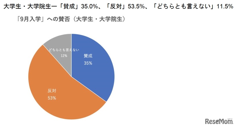 日本若者協議会は2020年5月12日、「9月入学」の是非に関する学生アンケート結果を発表した。小学生~大学院生全体では、「賛成」37.2%、「反対」47.0%、「どちらとも言えない」15.8%と、反対が賛成を上回った。