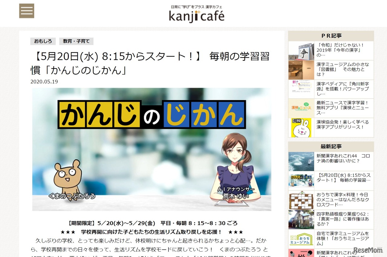 日本漢字能力検定協会は2020年5月20日から29日の平日、休校明けからスムーズに学校生活へ戻れるように、学校再開に向けた生活リズムの取り戻しを応援する中学生向け学習支援動画「かんじのじかん」を配信する。