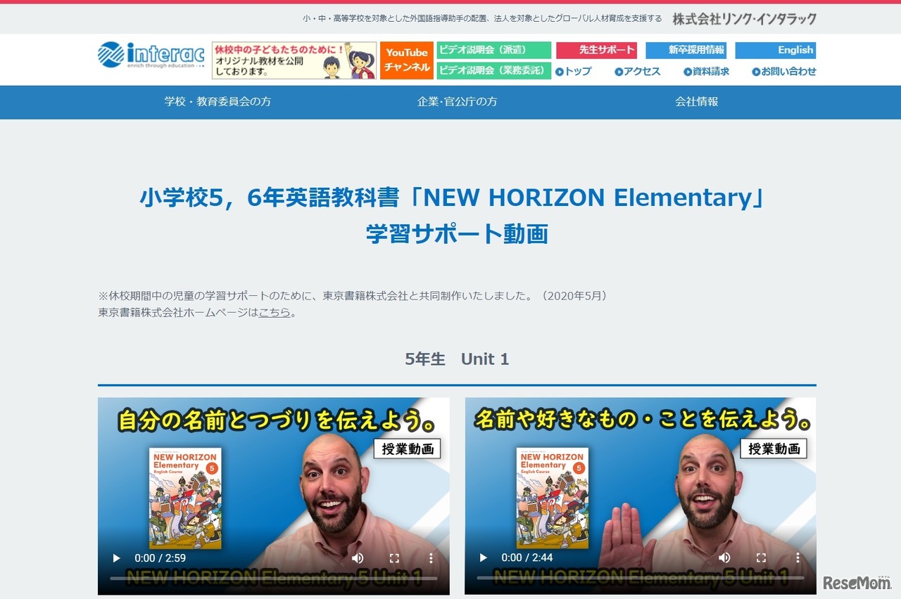 リンク・インタラックは2020年5月18日、休校期間中の児童の学習をサポートするため、東京書籍発行の小学校5・6年生用英語教科書「NEW HORIZON Elementary English Course5・6」に関連するサポート動画をWebサイトにて公開した。