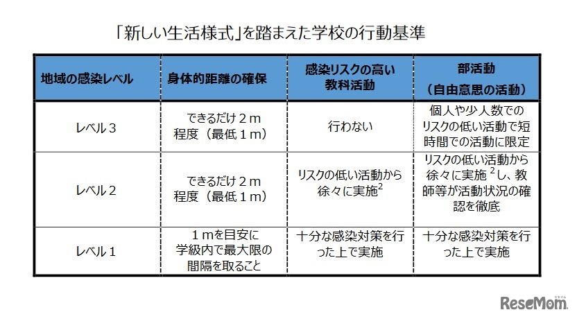 文部科学省は2020年5月22日、学校における新型コロナウイルス感染症に関する衛生管理マニュアル「学校の新しい生活様式」を作成し、全国の教育委員会などに通知した。地域の感染レベルを3段階に分け、身体的距離などの行動基準を示している。