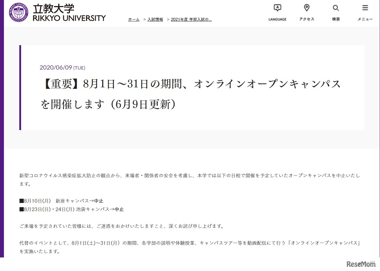 新型コロナウイルスの影響で、各大学のオープンキャンパスや相談会は中止となっているが、オンラインを利用して行う大学が増えている。明治大学はオンラインによる相談会、立教大学と青山学院大学はオープンキャンパスを実施する。