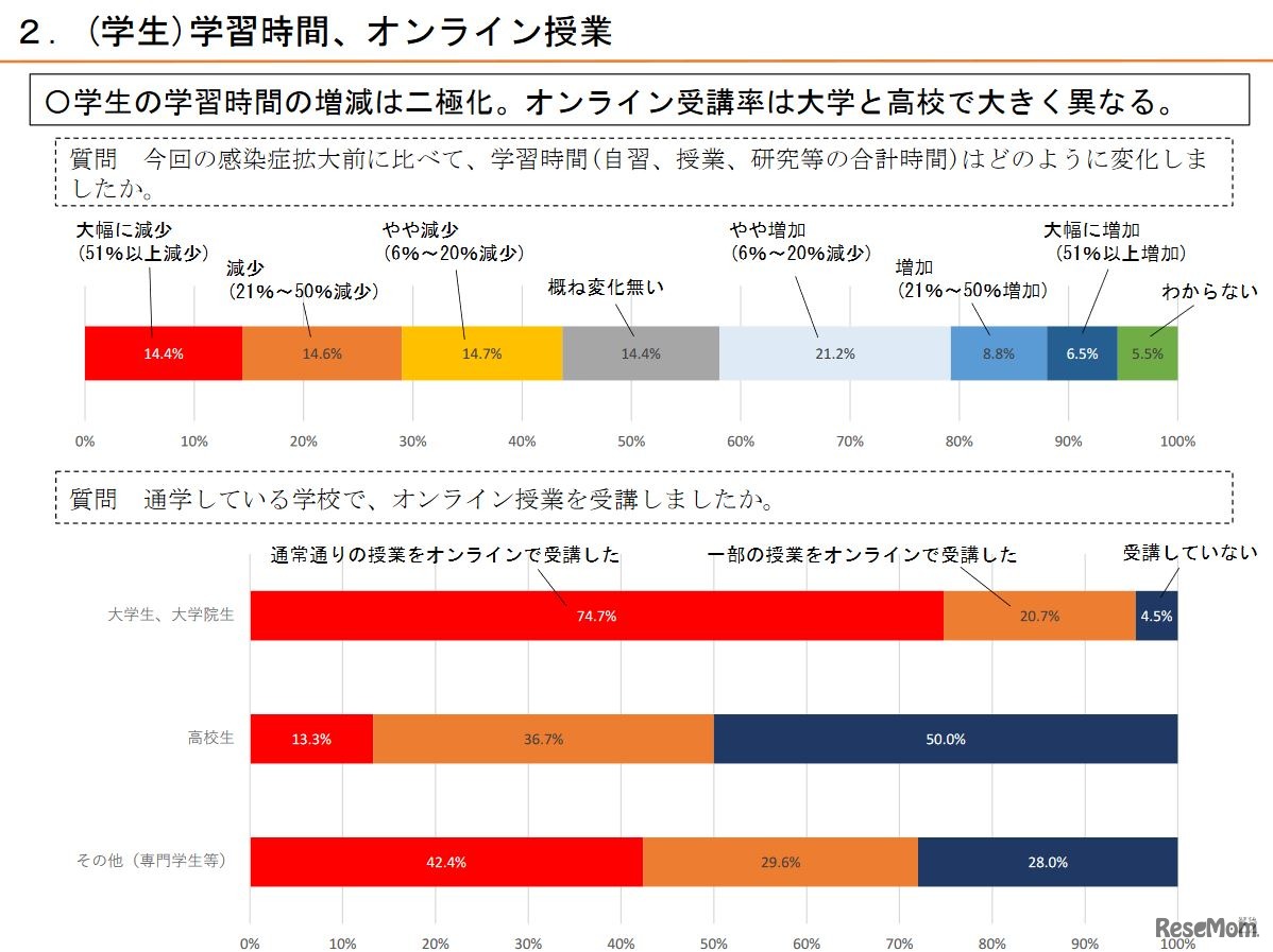内閣府は2020年6月21日、新型コロナウイルス感染症による生活意識・行動の変化について調査結果を公表した。約7割の子育て世帯で、家族と過ごす時間が増加。感染拡大前より生活全体で満足度が低下したが、夫の家事・育児役割が増えた家庭は、低下幅が小さい傾向にあった。