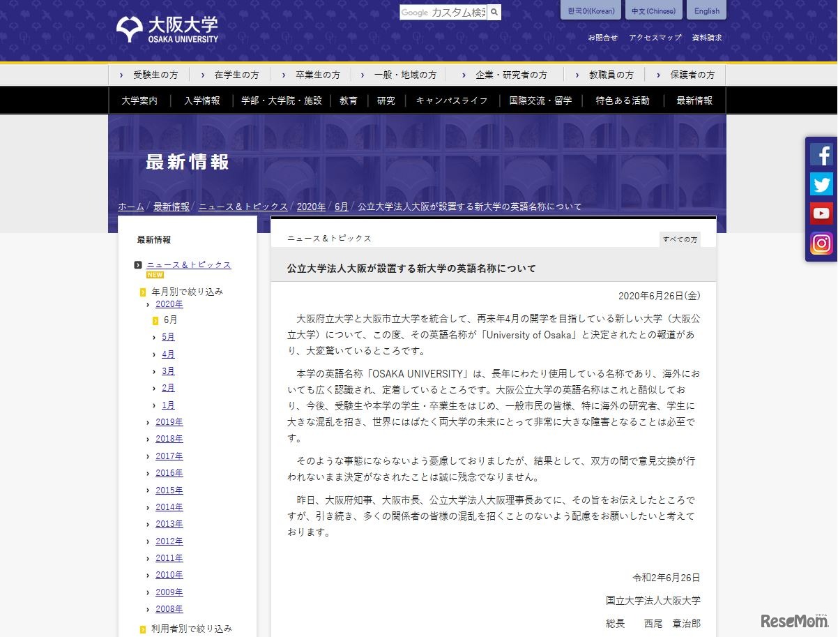 公立大学法人大阪は2020年6月26日、大阪府立大学と大阪市立大学を融合して新たに設置する新大学の名称を「大阪公立大学(英語表記:University of Osaka)」に決定したと発表した。一方、大阪大学(同:OSAKA UNIVERSITY)は英語名称が酷似を指摘している。
