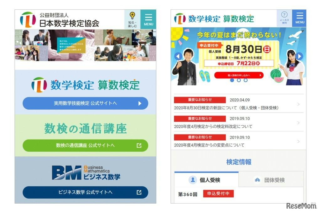 日本数学検定協会は2020年7月7日、日本数学検定協会と実用数学技能検定(数学検定・算数検定)の公式サイトを4年ぶりにリニューアルして公開。モバイル端末での操作性が向上し、よりスムーズに情報の閲覧ができるようになった。