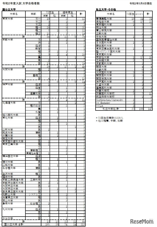 灘高等学校は、2020年度入試の大学合格者数を発表した。東京大学に79人、京都大学に49人、慶應義塾大学に24人、早稲田大学に23人合格した。卒業生に占める現役合格者の割合は、東京大学が25.9%、京都大学が14.1%だった。