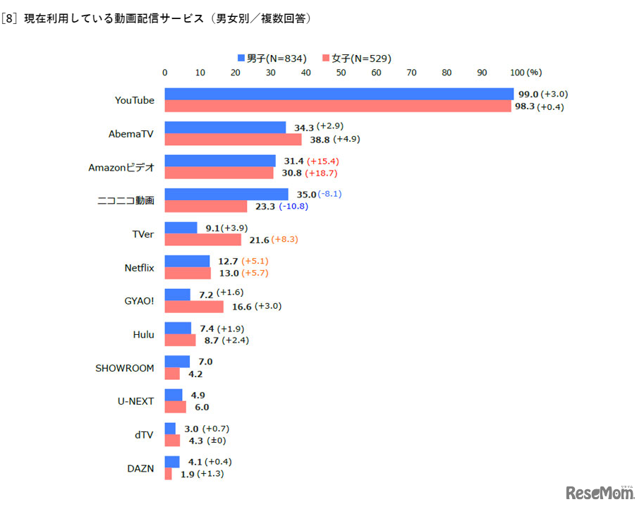 [8]現在利用している動画配信サービス(男女別/複数回答)
