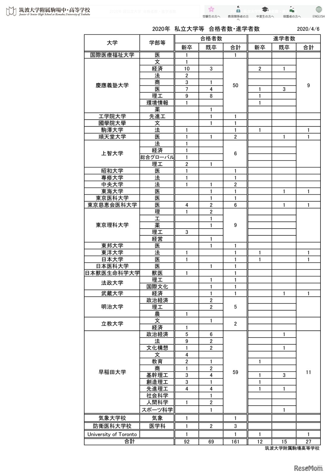 筑波大学附属駒場高等学校は、2020年大学入試結果を発表した。2020年4月6日時点で、東京大学に93人、早稲田大学に59人、慶應義塾大学に50人合格したことがわかった。卒業生(161人)に占める東大現役合格者(72人)の割合は44.7%だった。