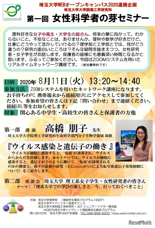 【夏休み2020】埼玉大、理系志望の中高生対象「女性科学者の芽セミナー」8/11 1枚目の写真・画像