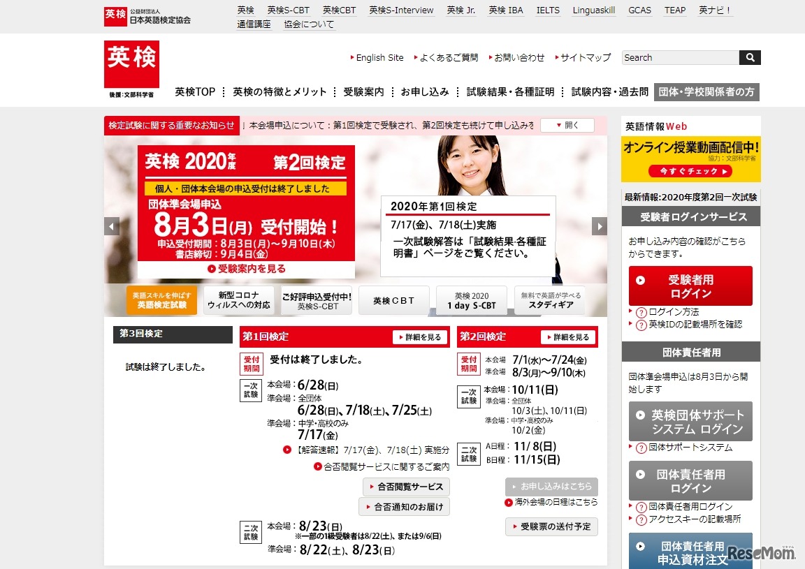 日本英語検定協会は、2020年7月25日に実施した「2020年度第1回実用英語技能検定試験一次試験」の解答速報を7月27日午後1時以降にWebサイトに公開する。一次試験の合否結果・成績表の閲覧サービスは8月11日に開始予定。
