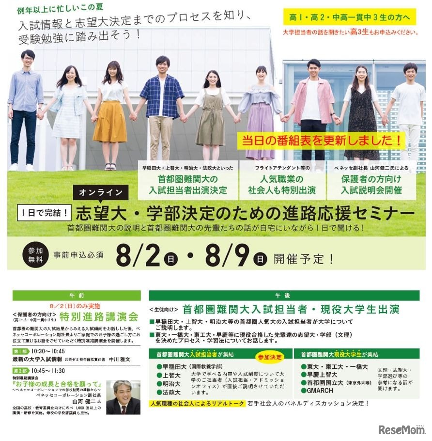 ベネッセホールディングス子会社のお茶の水ゼミナールは、首都圏難関大を志望する受験生向け無料オンラインセミナー「志望大・学部決定のための進路応援セミナー」を2020年8月2日と9日に開催する。