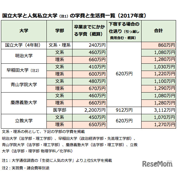 国立大学と人気私立大学の学費と生活費一覧(2017年度)