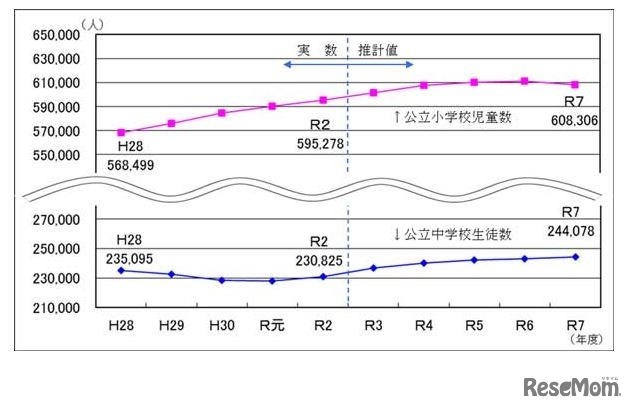 東京都教育委員会は2020年9月24日、2020年度(令和2年度)教育人口等推計(速報値)の概要を公表した。5年後の2025年度(令和7年度)には2020年度実数と比較して、公立小学校児童が2.19%増の60万8,306人、公立中学校生徒が5.74%増の24万4,078人と見込まれている。